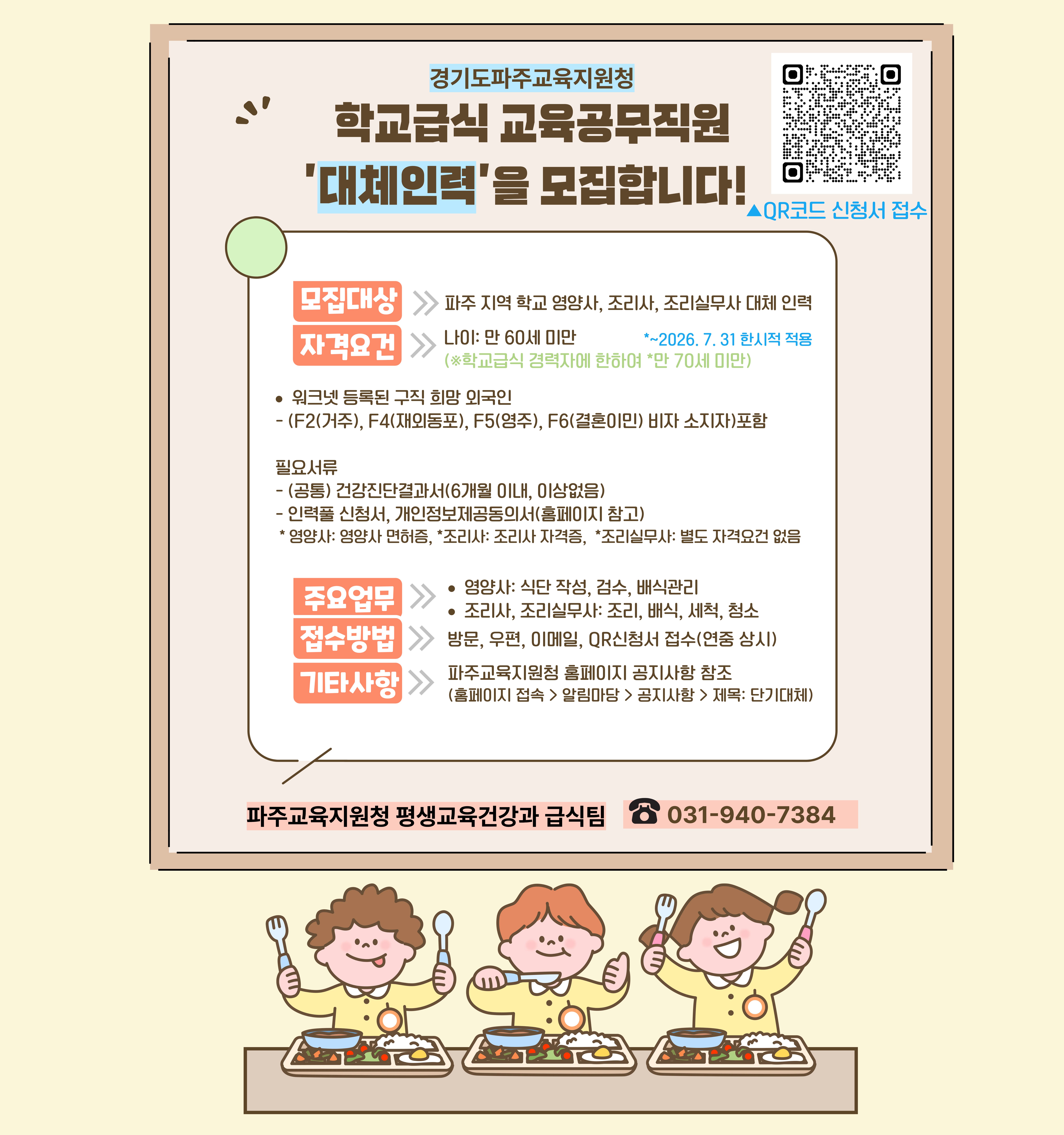 한국교육환경보호원 건강증진센터에서 급식 분야 채용 공고가 내려와 안내드립니다.- 접수기간: 2026.04.01.(수)~04.13.(월) 14:00까지- 접수방법: 온라인 접수(https://schoolkeepa.applyin.co.kr/)- 모집분야 및 인원자세한 내용은 첨부파일 참조채용직급분야선발예정인원담당 직무일반계약직학교급식(석사이하)1명? 학교급식 분야 사업 수행 및 지...