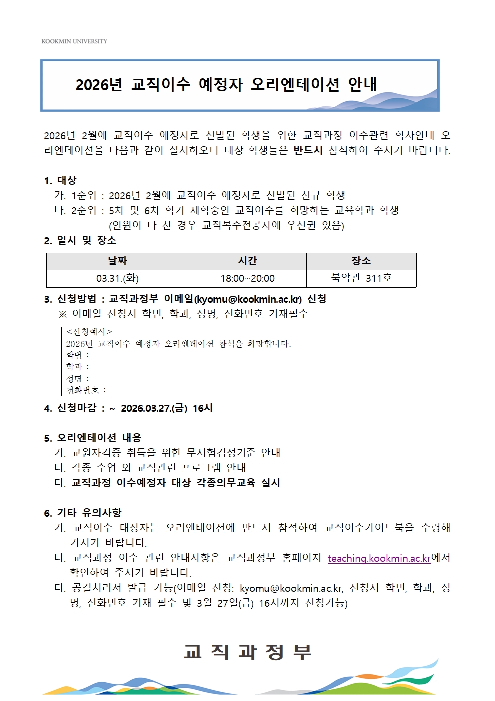 2026년도 교직이수 예정자 대상 오리엔테이션 실시 안내