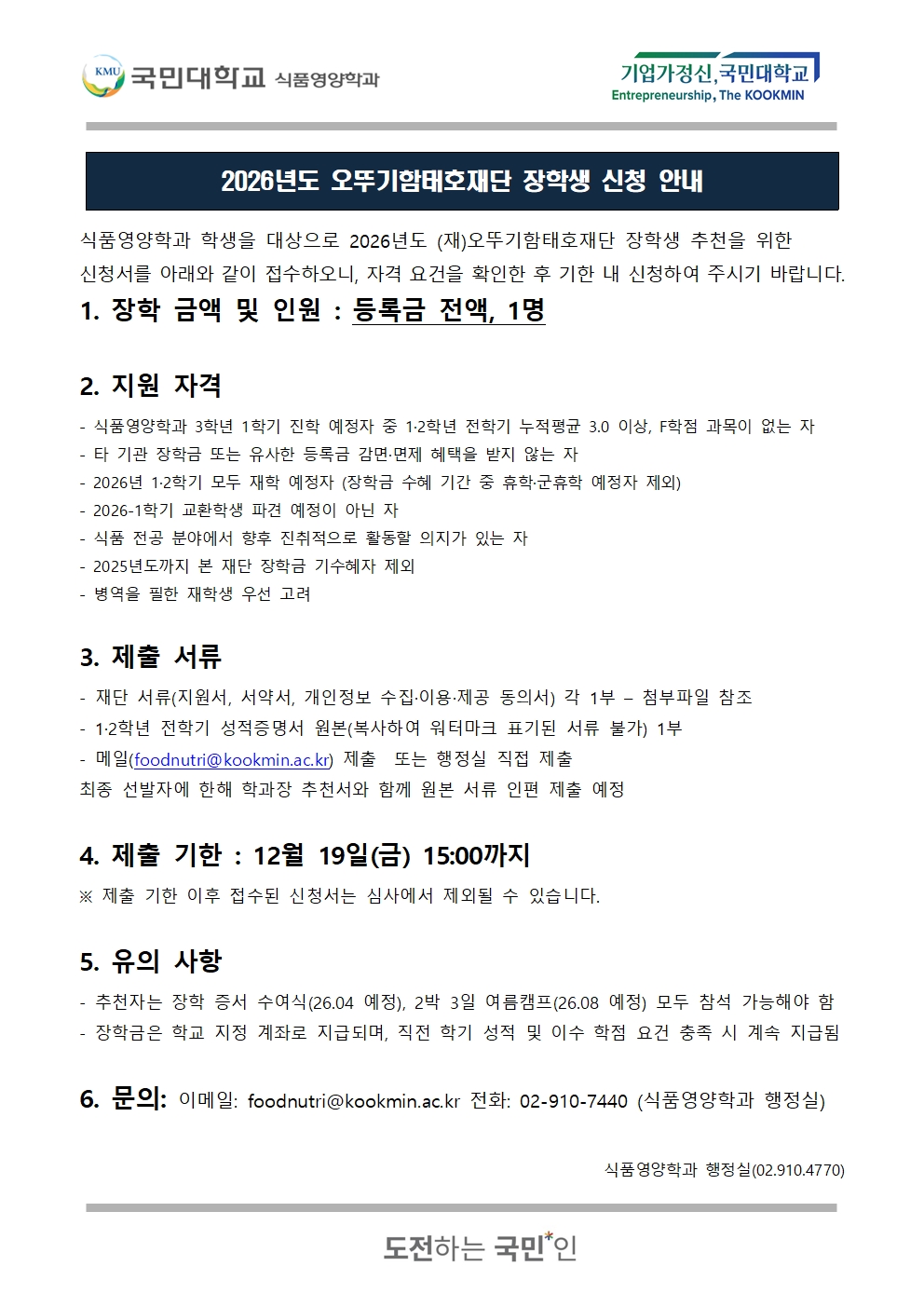 2026년도 오뚜기함태호재단 장학생 신청 안내(~12/19 15:00)