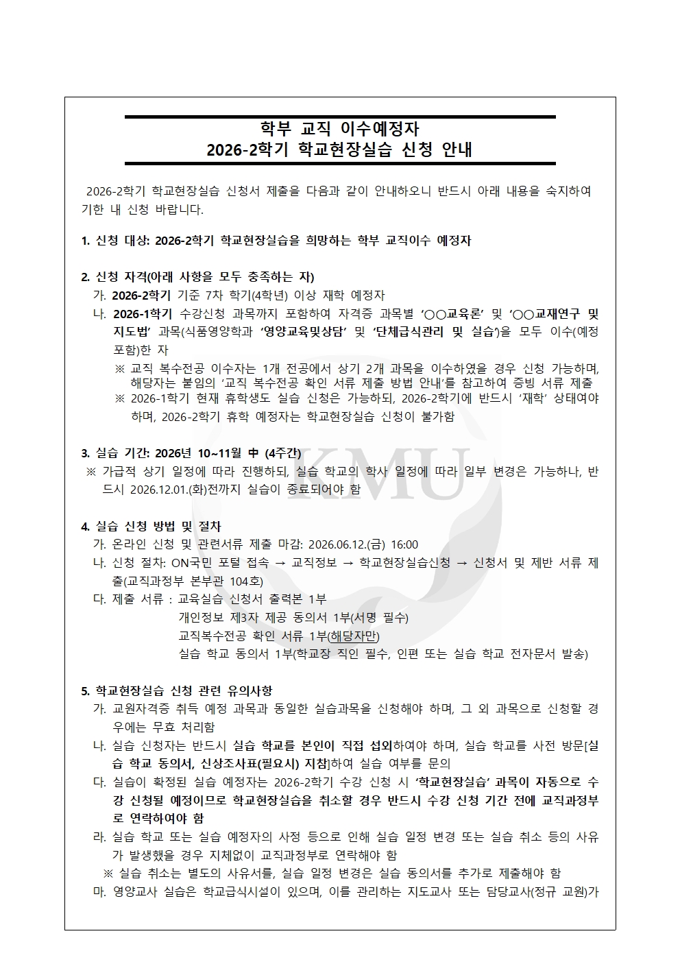 학부 교직 이수예정자 2026-2학기 학교 현장실습